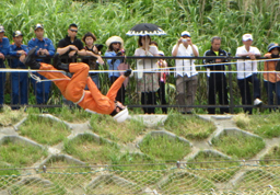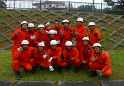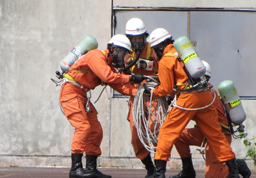 オレンジの服を着た救助隊は、日頃から、救助に必要な高い知識と技術を身に付け、救助工作車で出動し、生命を救うため、厳しい訓練を行っています。