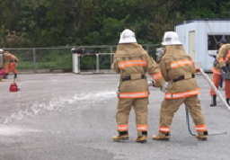 火災出動する警防隊員は、逃げ送れた人の救助と火災による被害を最小限にくい止めるために防火服を着用、ポンプ車、水そう車で出動し消火活動を行います。
