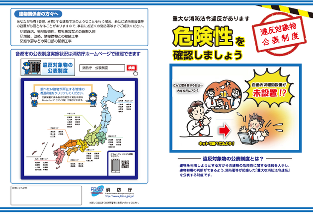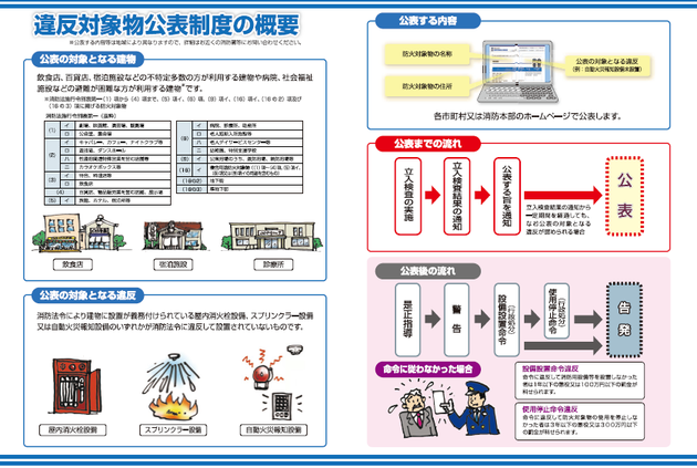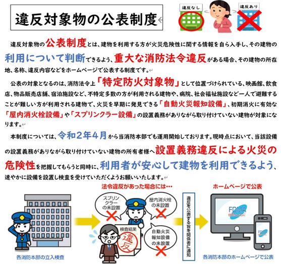 違反対象物の公表制度とは、建物を利用する方が火災危険性に関する情報を自ら入手し、その建物の利用について判断できるよう、重大な消防法令違反がある場合、その建物の所在地、名称、違反内容などをホームページで公表する制度です。