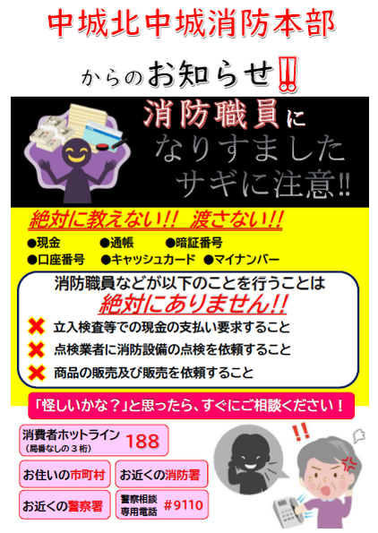 予防 なりすまし詐欺に注意 消防用設備等点検に関する不正取引について 沖縄県内において飲食店の営業時間内に消防職員と名乗り、立入検査を装って消防用設備等点検を実施、点検料を要求するといった不正取引が発生いたしました。 所有者は、点検料を要求され現金で支払ったということです。 一般住宅に消火器点検と称し、金銭のやり取りはなかったものの消防職員を名乗る報告事例もあります。 消防職員や消防団員が点検を行うことは 絶対にありませんので注意してください!